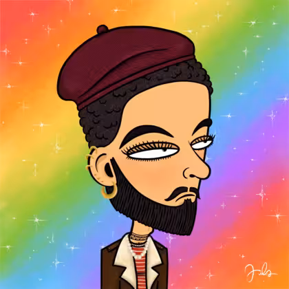 Collection Depressed Citizens Artist Juls Description ART. No team, no project, no future. Depressed Citizens is an urban & existential Art expression on Ordinals. In a parallel universe, "THEI" control us. DC unites against toxic society, encouraging critical thinking. 100% hand made collection that took Juls more than 6 months of daily work. Name Citizen#2608 Origin LGBT-Q+ Gender Non-binary Necklace Pearl necklace Hat Burgundy beret Mustache Beard Garibaldis beard Glasses No Glasses Earrings Helix ring trio Hair Style Short tight curls Clothes Red stripe long-sleeve shirt Tattoo Maya tattoo Star Background With stars